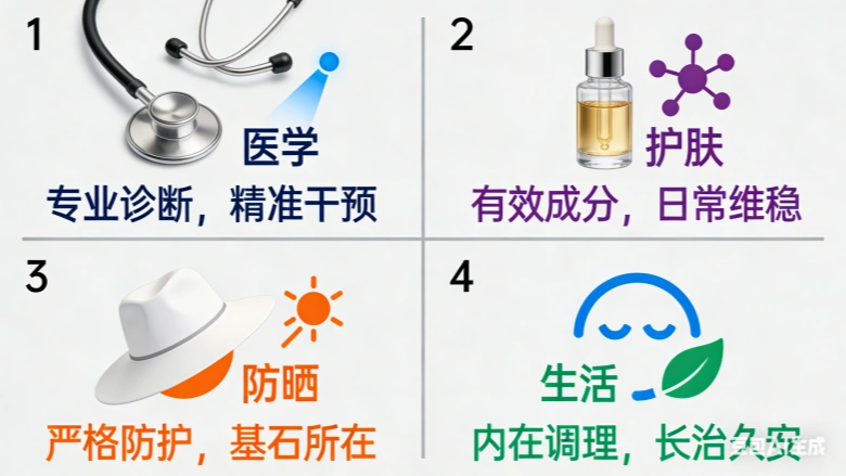 - 第二步:建立日常铁律。严格防晒 + 温和清洁 + 屏障修复。
