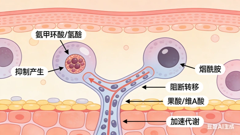 - 阻断黑色素转移:烟酰胺(维生素B3)。