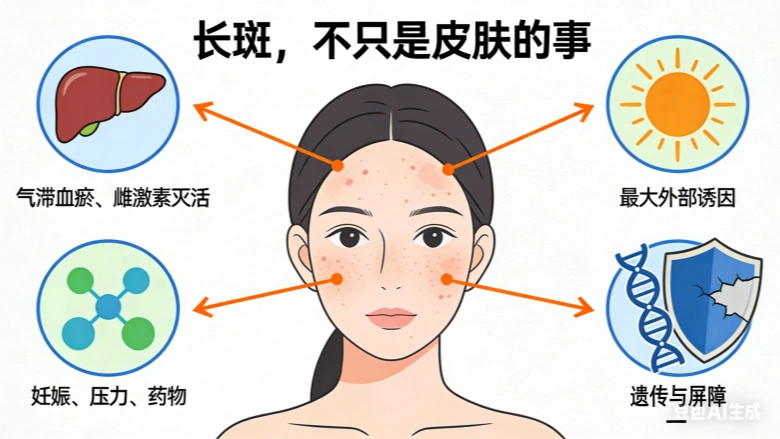结论:长斑,尤其是对称分布在面颊、额头的黄褐斑,可能与肝功能失调有关(中医的“肝”不完全等同于西医的“肝脏器官”,但包含其功能)。但它绝不仅仅是肝的问题,而是由紫外线、激素、遗传、皮肤炎症、情绪压力、作息等多种内外因素共同促成的。