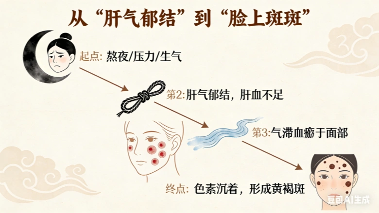 • 肝肾同源:肝肾亏虚,特别是肾阴不足,会导致虚火上炎,灼伤面部,也易生斑。