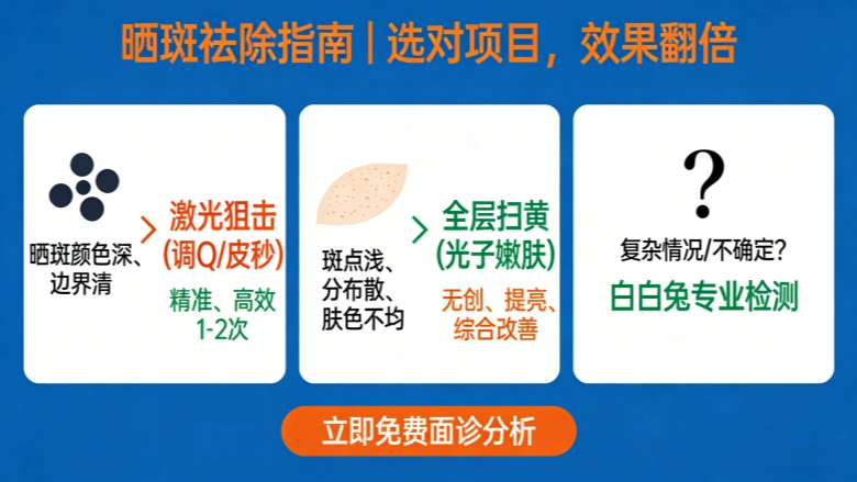 针对晒斑(又称日光性黑子),医美项目非常有效,因为它们能精准地作用于皮肤深层黑色素。选择哪种项目,主要取决于斑点的深浅、密度、您的肤质以及预算