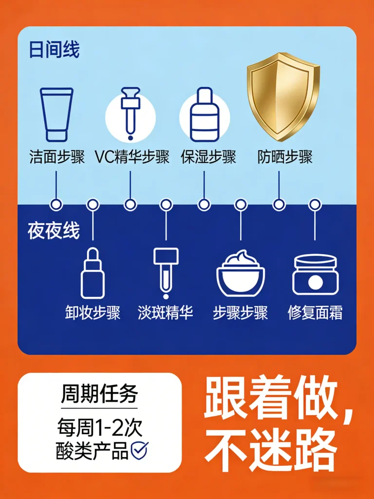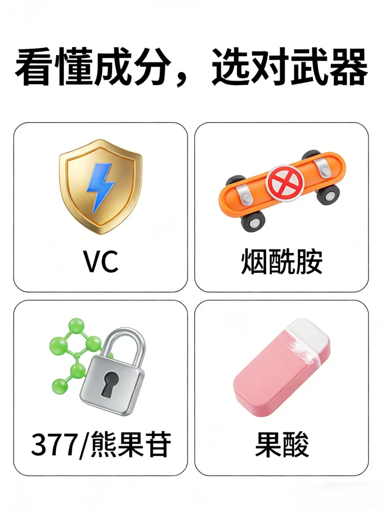 - 新手入门/敏感肌: 防晒 + 烟酰胺 是安全有效的起步组合。