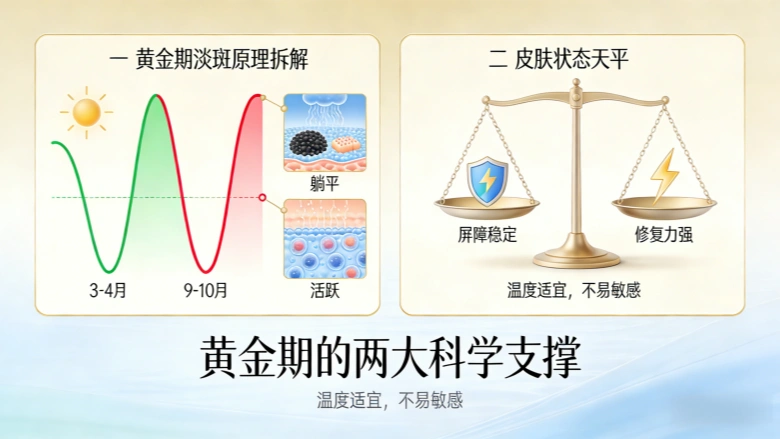 这两个季节太阳不算毒辣,紫外线强度低,黑色素不容易活跃。不像夏天,刚淡一点的斑点就容易被晒黑反弹,冬天又太冷,皮肤代谢慢,淡斑效率会变低。