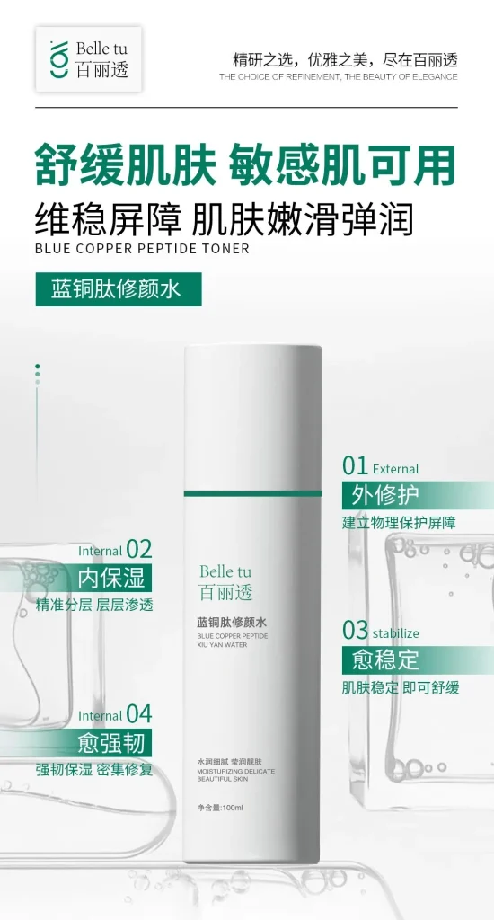 •蓝铜肽修颜水: 选择有舒缓修护功能的,为皮肤快速补充水分。