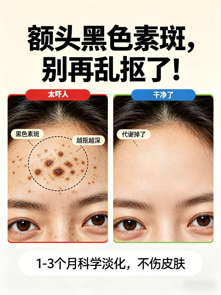 先跟姐妹们说重点:额头黑色素斑≠“绝症”,但绝对不能瞎抠、瞎用猛药!它的形成核心是「黑色素细胞异常活跃」,可能和紫外线照射、额头出油堵塞、内分泌波动、长期熬夜有关,去除的关键是「抑制黑色素生成+加速代谢+严格防晒」,三步缺一不可✅